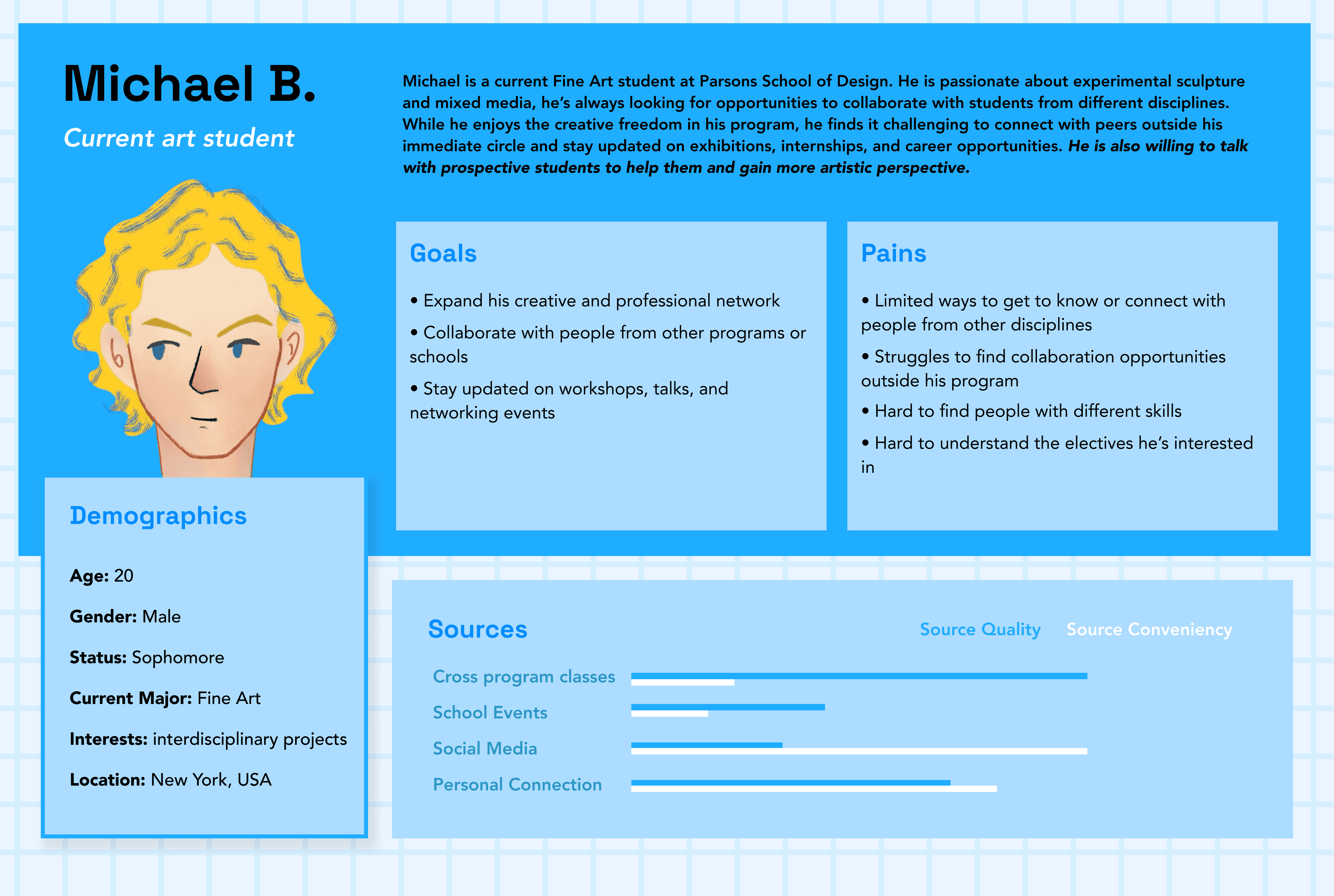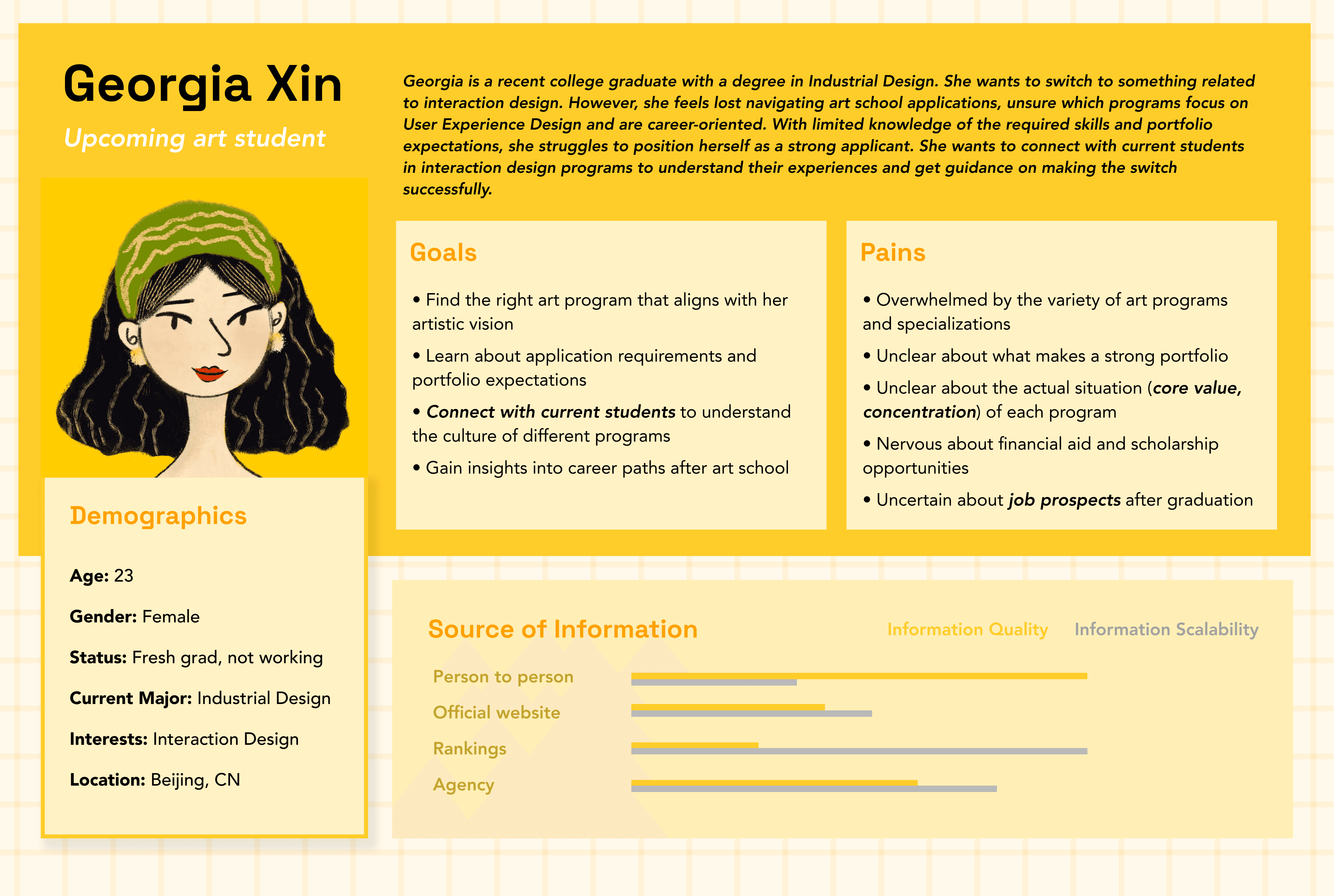 To better understand the different types of challenges and concerns prospective art students face as they research, apply, and prepare for art school, I conducted 20 interviews: 10 prospective students currently preparing their applications. 10 current students reflecting on their past application experiences.