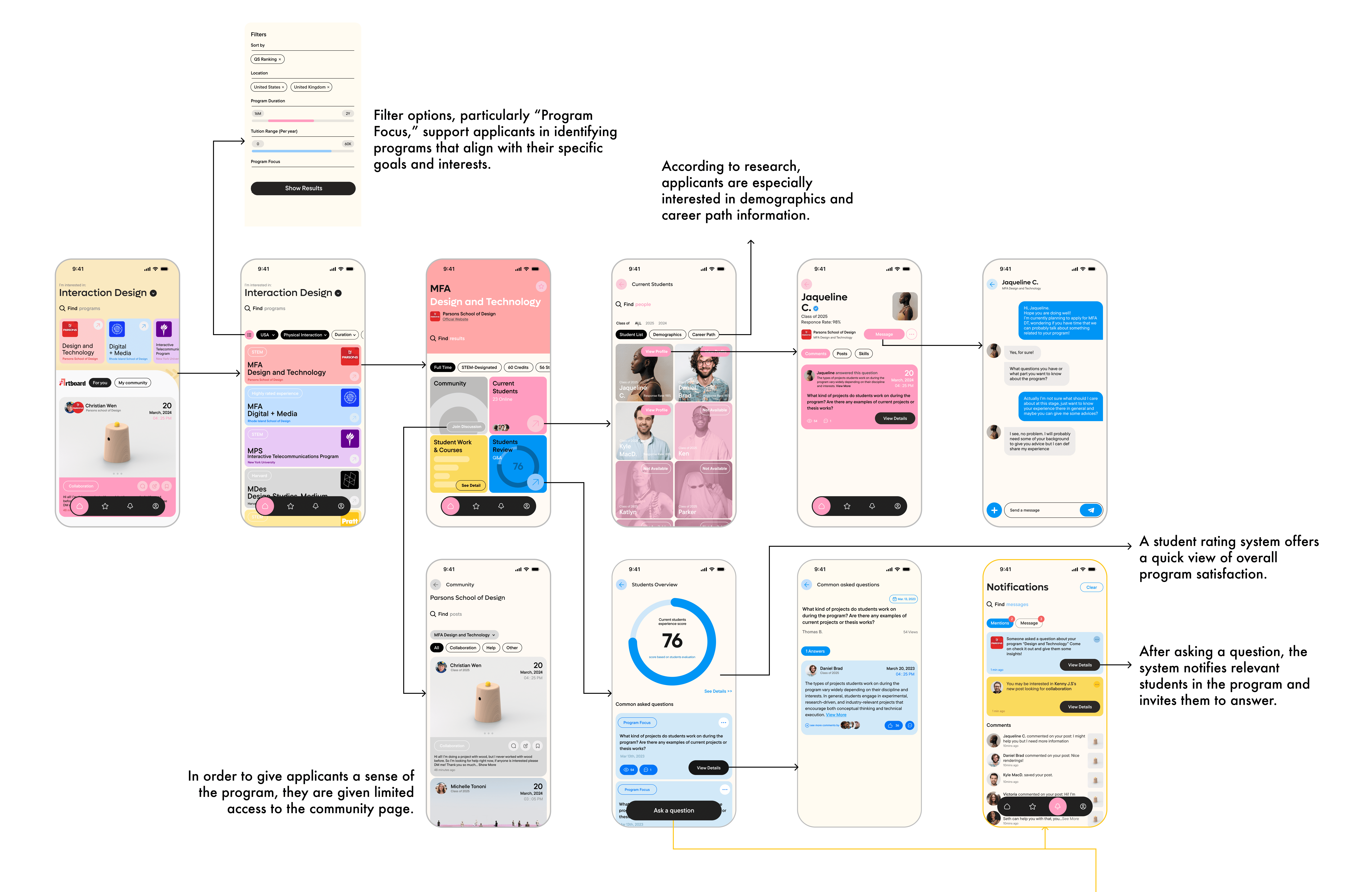 As both the designer and the user, I initially approached the problem through my own experience, how lost I felt during my application process and wishing I could talk to someone already in the program. But being so close also brought blind spots. Research helped me step back and understand a wider range of needs from both applicants and current students.